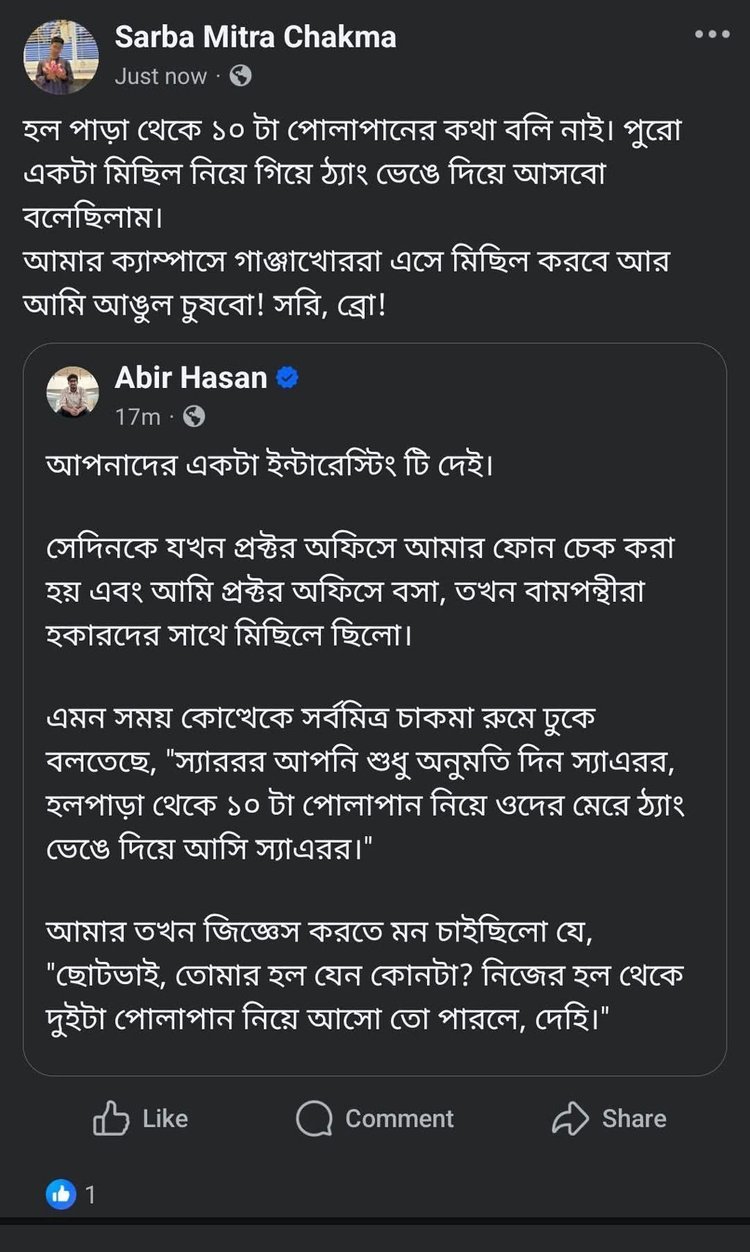 মঙ্গলবার (২৮ অক্টোবর) দুপুরে নিজের ভেরিফায়েড ফেসবুক পেজে দেওয়া এক স্ট্যাটাসে আবির অভিযোগ করেন, প্রক্টর অফিসে উপস্থিত অবস্থায় সর্বমিত্র চাকমা বামপন্থী শিক্ষার্থীদের উদ্দেশে বলেন, ‘স্যার, অনুমতি দিন, হলপাড়া থেকে ১০ জন নিয়ে গিয়ে তাদের ঠ্যাং ভেঙে দিয়ে আসি।’