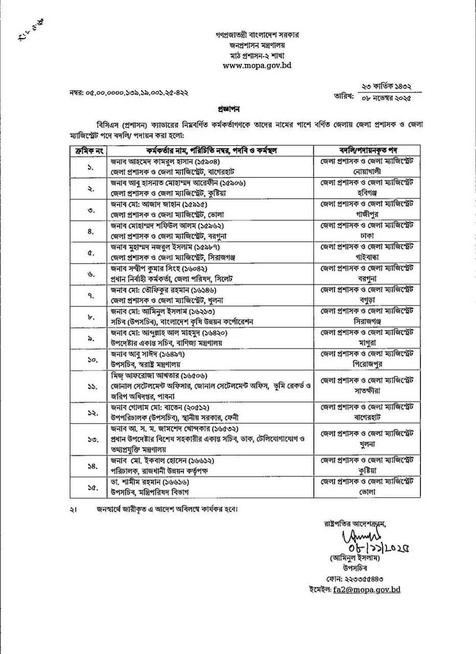 ১৫ জেলায় নতুন জেলা প্রশাসক নিয়োগ, মধ্যরাতে প্রজ্ঞাপন