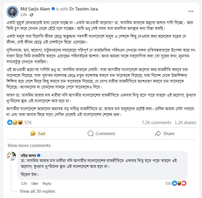 সারজিস আলম লিখেছেন, 'একটা মুহূর্ত কোনোভাবেই মাথা থেকে যাচ্ছে না। আওয়ামী লীগের একজন ডা. তাসনিম জারাকে অশ্রাব্য ভাষায় গালি দিচ্ছে। আর তিনি চুপ করে সেখান থেকে হেঁটে চলে যাচ্ছেন। আমি শুধু সেই সময় তার মানসিক অবস্থার কথা চিন্তা করছি।'