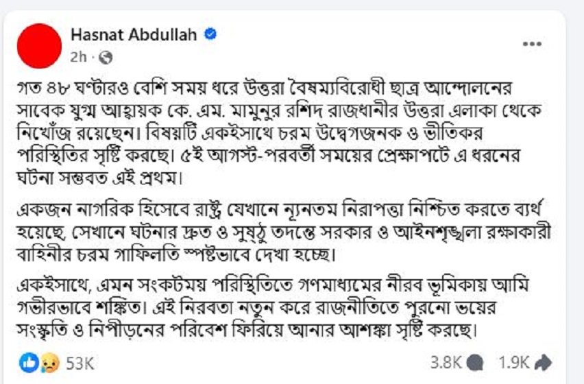 হাসনাত লেখেন, ‘গত ৪৮ ঘণ্টারও বেশি সময় ধরে উত্তরা বৈষম্যবিরোধী ছাত্র আন্দোলনের সাবেক যুগ্ম আহ্বায়ক কে এম মামুনুর রশিদ রাজধানীর উত্তরা এলাকা থেকে নিখোঁজ রয়েছেন। বিষয়টি একই সঙ্গে চরম উদ্বেগজনক ও ভীতিকর পরিস্থিতির সৃষ্টি করছে। ৫ আগস্ট-পরবর্তী সময়ের প্রেক্ষাপটে এ ধরনের ঘটনা সম্ভবত এই প্রথম।’