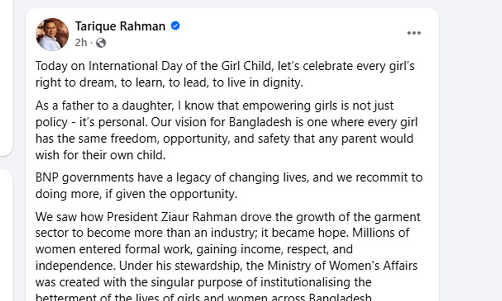আন্তর্জাতিক কন্যাশিশু দিবস উপলক্ষে বিএনপির ভারপ্রাপ্ত চেয়ারম্যান তারেক রহমানের দেওয়া পোস্টটি নিচে তুলে ধরা হলো: